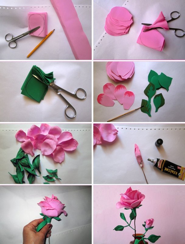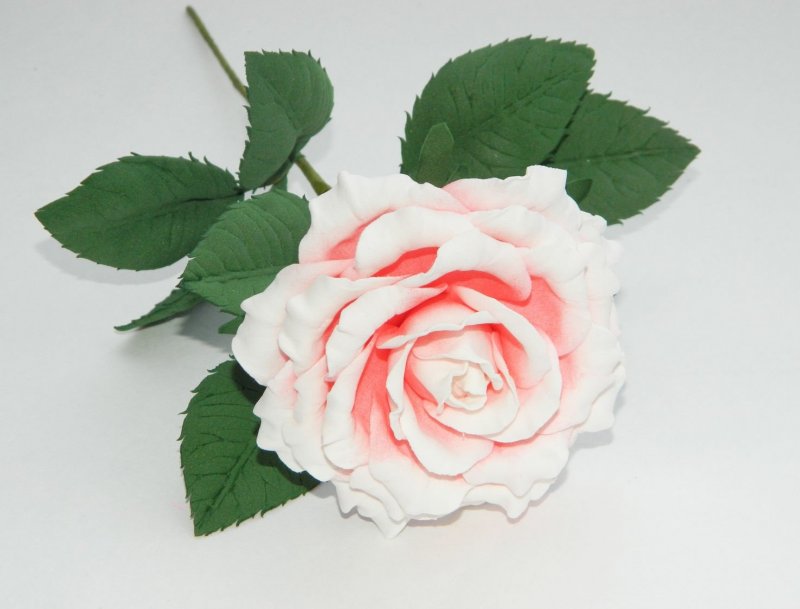 Выполняя поэтапно все действия в пошаговом описании, предложенные мастер-классом, можно добиться полного соответствия такой розы своему живому аналогу. Для работы потребуется фоамиран розового или белого цвета, кусочек проволоки, вата, масляная пастель, креповая бумага, клей ПВА.