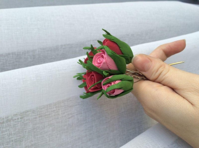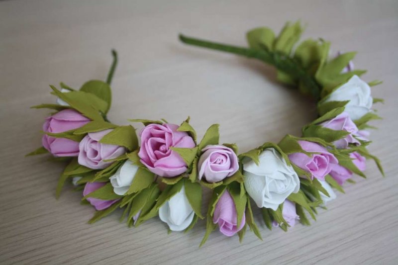 Миниатюрные розочки можно собрать в композицию и поместить в вазу или горшок, расположить на ободке в виде оригинального венка. Работа предвидится несложная, но кропотливая. Потребуется подготовить фоамиран подходящего цвета для бутонов и листков, тонкую проволоку, тейп-ленту, клеящие вещества, маникюрные ножницы или фигурный дырокол.