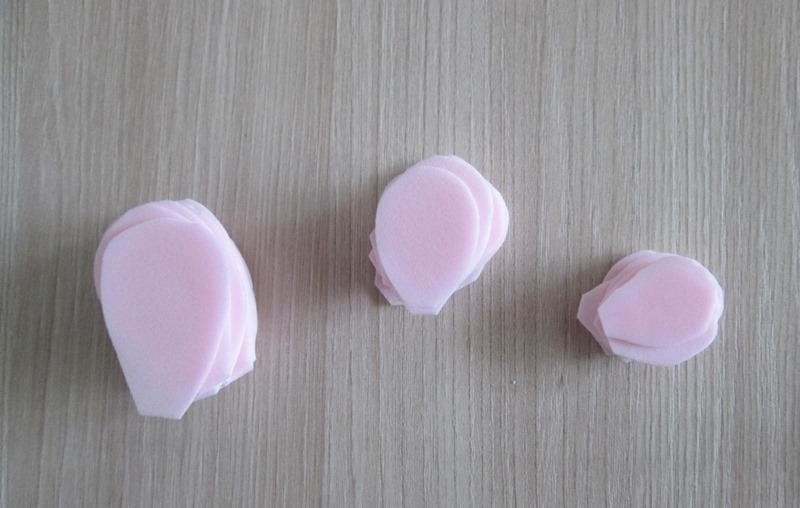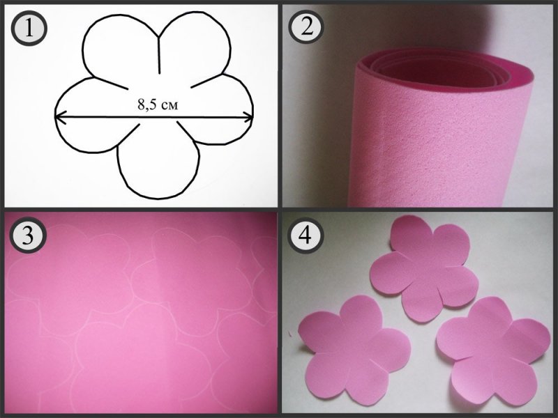 Для работы потребуется фоамиран розового или красного цвета, маленький зеленый кусочек для листиков. Также нужен набор стандартных инструментов и несколько подходящих бумажных шаблонов. Готовим выкройки для лепестков – вырезаем три разных круга из бумаги, делим их на пять частей, формируем из каждого сектора закругленный лепесток.
