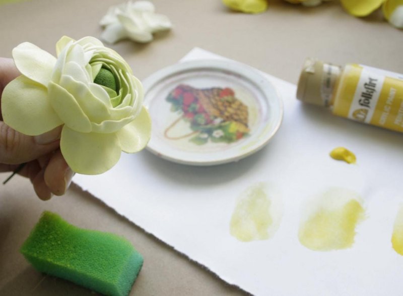 Благодаря особой структуре краска в фоам отлично впитывается, заполняя поры. Покрашенное изделие не пачкает руки и одежду, может подвергаться сухой чистке и мытью. Тонируют лепестки фоамирана красками следующего типа: