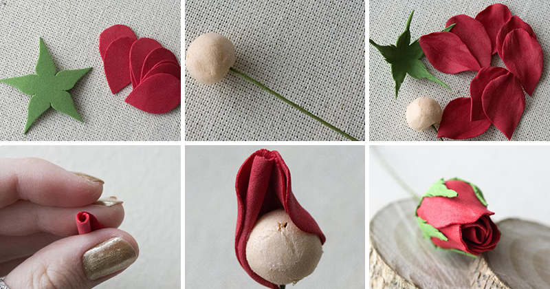 Простые и красивые бутоны можно сделать из минимума материалов. Работать будем с пенопластовым шариком методом наращивания на нем лепестков. По выкройке в виде капли вырезаем 8-мь деталей, подготавливаем звездочку из зеленого кусочка вспененной резины для чашелистика.