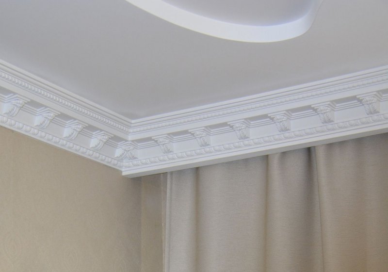 После установки натяжного полотна между стеной и профилем остается щель. Выглядит это неэстетично, поэтому образовавшийся проем следует закрыть. Чтобы сделать композицию целостной и законченной, используют потолочный плинтус для натяжных потолков. Содержание Преимущества и недостатки натяжных потолков с плинтусом Материал плинтусов для натяжных потолков Пенопластовые Полиуретановые Пластиковые Техника и правила монтажа плинтусов Альтернатива плинтусам Декоративная вставка Декоративные шнуры Как выбрать плинтус для натяжного потолка Ширина плинтуса Форма плинтуса Стиль и цвет Преимущества и недостатки натяжных потолков с плинтусом Практичные и долговечные натяжные покрытия не утрачивают своей популярности. Существует огромное множество вариантов и для минималистичных помещений, и для роскошных вычурных залов. Для каждого случая можно выбрать подходящие аксессуары. Чаще всего для окантовки полотна используют обычные плинтусы – пенопластовые или полиуретановые. Бордюр может быть строгим – гладким и плоским и наоборот – габаритным, претенциозным, украшенным причудливой узорчатой резьбой. Размерный ряд багетов также весьма широк. Главное достоинство потолочных плинтусов в том, что они красиво обрамляют потолок, превращая его в произведение дизайнерского искусства. Выбирая плинтус нужно ориентироваться на габариты помещения и его стиль. Крупноформатный резной вариант только подчеркнет скромные размеры комнаты, визуально сделает ниже потолки. Столь же неприемлем подобный аксессуар в современных и минималистичных интерьерах. Он хорошо впишется в барочные интерьеры, а для стиля хай-тек лучше использовать гибкие ленты, которые крепятся непосредственно к профилю и полностью закрывают технологический паз между стеной и потолком. Материал плинтусов для натяжных потолков Для отделки натяжного потолка наиболее подходящими считаются галтели из пенопласта, полиуретана или пластика. Остановимся более подробно на особенностях, преимуществах и недостатках каждого из материалов. Пенопластовые Пенопластовые плинтусы – используются наиболее часто. Они мало весят, легко режутся и монтируются. Изделия представлены в продаже в виде галтелей с длиной от 1,3 до 2 метров. Дизайн бордюра бывает самым разным – с простым геометрическим узором или имитацией лепнины, резьбы. Обычно это аксессуары белого цвета, но при необходимости их можно окрасить в тон, совпадающий или контрастирующий с цветом потолка. Элементы лучше окрашивать до монтажа, но при необходимости можно придать им цвет и на стене. Главное – накрыть пленкой соседние участки, чтобы не забрызгать их краской. Материал неподатливый и согнуть его невозможно. Поэтому его лучше не использовать на неровных стенах или в местах закруглений. В местах неплотного прилегания галтель не получится приклеить достаточно надежно. Для фиксации плинтусов применяют: жидкие гвозди; финишную шпаклевку; клей на водной основе. Полиуретановые Материал сравнительно тяжелее предыдущего. Поэтому для его монтажа используют специальный состав. Часто производители в дополнение к своему полиуретановому продукту предлагают фирменный клей. Он идеально подходит для галтелей той же компании. Например, полиуретановая лепнина ORAC Decofix и клей ORAC-Fix Extra. Состав клея максимально приближен к с