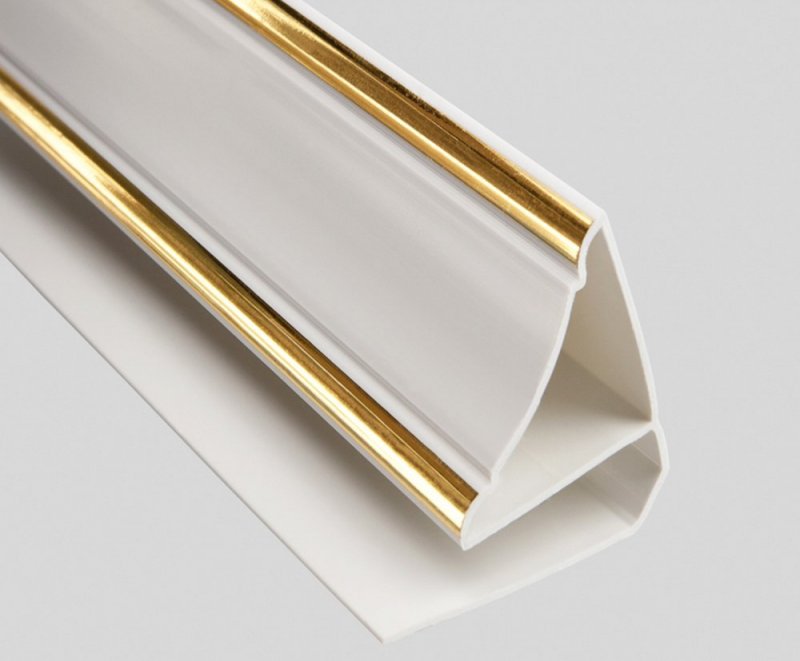 Плинтуса из поливинилхлорида идеально подходят для пленочных потолков, так как их состав практически идентичен. Материал отлично переносит влажность, поэтому весьма востребован на кухне, в ванной, в туалете. Плинтус из ПВХ можно мыть, не опасаясь за его целостность.