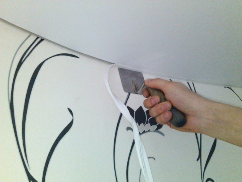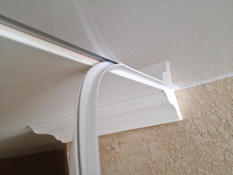 Эластичное полотно не должно контактировать с клеем. Поэтому молдинг крепится только к стене. Чтобы клей случайно не попал на пленку или ткань, следует закрыть ее полиэтиленом. Углы обрезаются с помощью стусла и ножовки или малярного ножа под углом 45 градусов. Торцы обязательно смазываются клеем. Если при соединении в углах образовались щели, необходимо замазать их шпаклевкой или герметиком.