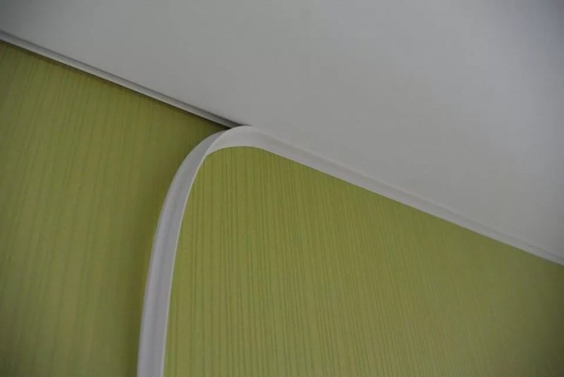 Узкая вставка выступает в качестве гибкой заглушки и отлично работает на кривых стенах, в углах и в качестве разделителя разных полотен в специальных профилях. Она подбирается под тон и фактуру основного материала. В итоге резиновая вставка практически сливается с глянцевым полотном и стык становится максимально незаметным. Другой вариант – контрастный материал. Такая лента может стать акцентом в интерьере или поддержать другие значимые детали. Широкая цветовая палитра изделий позволит удовлетворить любые дизайнерские задумки. Для фиксации гибкой вставки клей не используется – элементы крепятся прямо на профиль. При необходимости вставку можно легко снять и заменить на другую. Если материал подсох, восстановить его эластичность можно, подержав в теплой воде. В углах полосы подрезаются под углом 45 градусов с помощью ножа или кусачек.