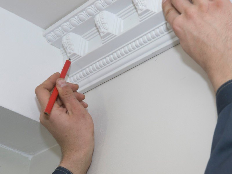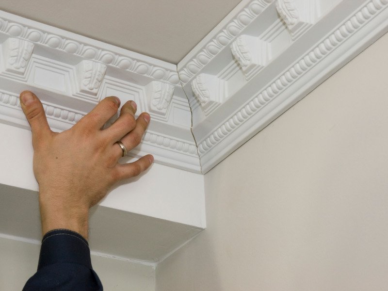 Для резки подобного материала необходимо запастись торцовочной пилой. Тяжелые крупноформатные карнизы нужно дополнительно фиксировать саморезами, шляпки которых впоследствии замазываются шпаклевкой или неагрессивной краской в цвет карниза.