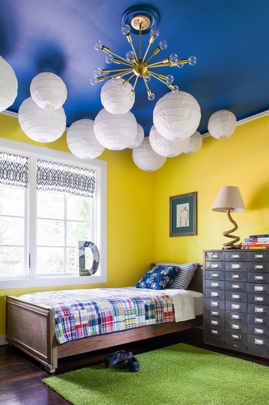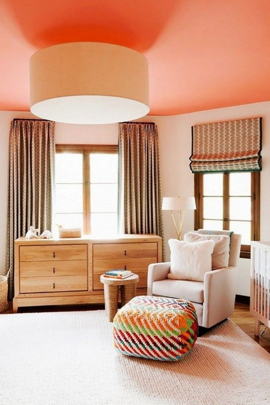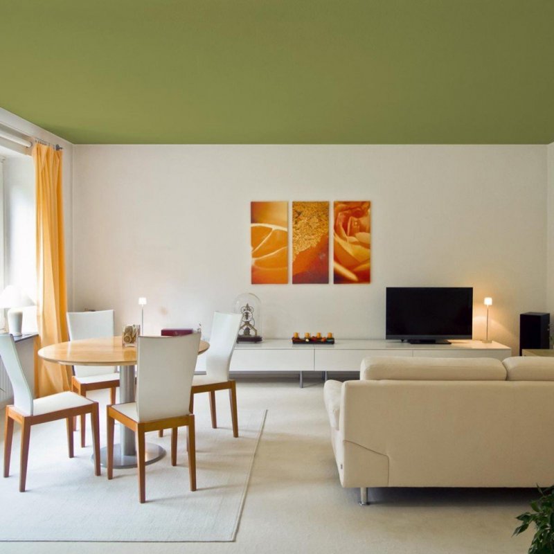 Для покраски лучше всего выбирать натуральные оттенки: голубой, бежевый, желтый, зеленый. Но цвет потолка может быть самым разнообразным. Остановимся на наиболее популярных цветах: