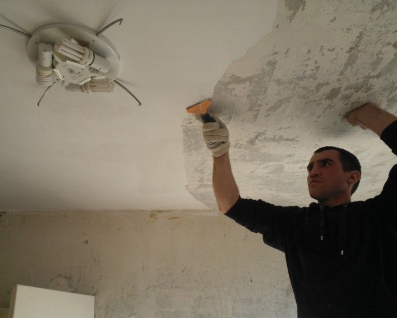 Когда вся влага впитается, это будет означать, что краска готова к отслоению. Теперь ее можно снять шпателем. Чтобы не поцарапать потолочную поверхность, инструмент следует держать под наиболее острым углом.