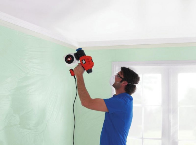 Краскопульт или другие машины лучше всего использовать для покраски больших помещений. Он существенно увеличивает производительность труда, позволяет распределить краску на потолке тонким ровным слоем. На поверхности не образуются разводы, а если все же появились свисающие капли, они легко очищаются при помощи губки. В отличие от валика и кисти, пульверизатор позволяет существенно сократить расход материала, что снижает конечную стоимость окраски.