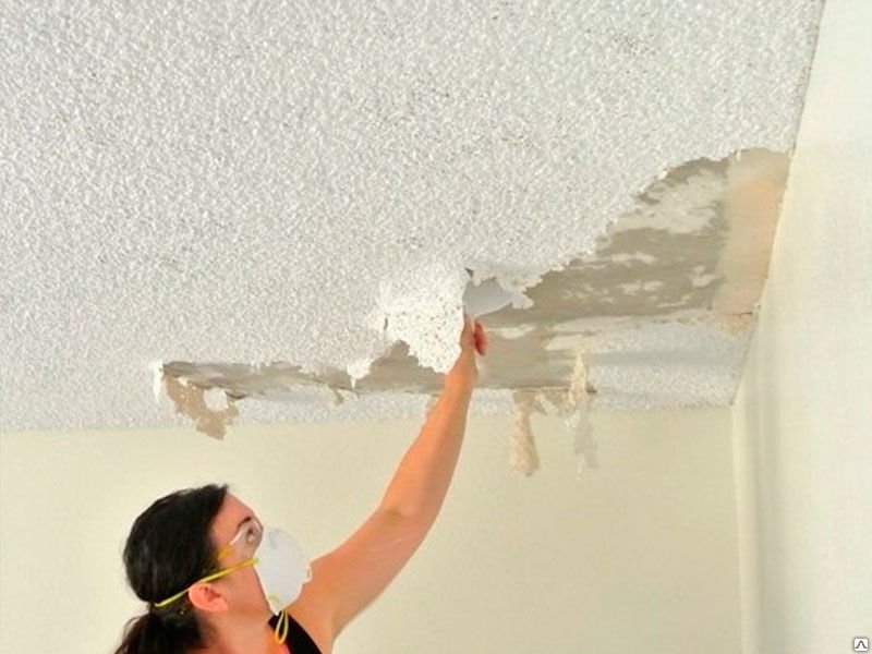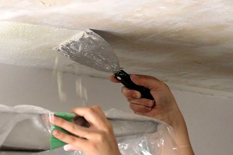 Потолочная плитка – отрываем с помощью скребка, зачищаем места с остатками плитки и клея.
