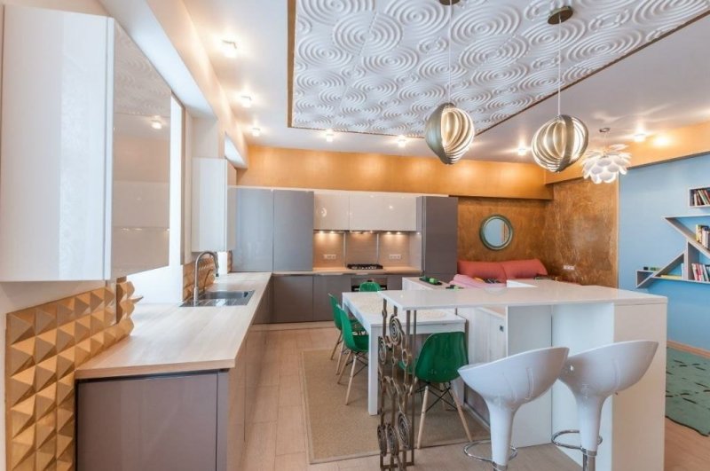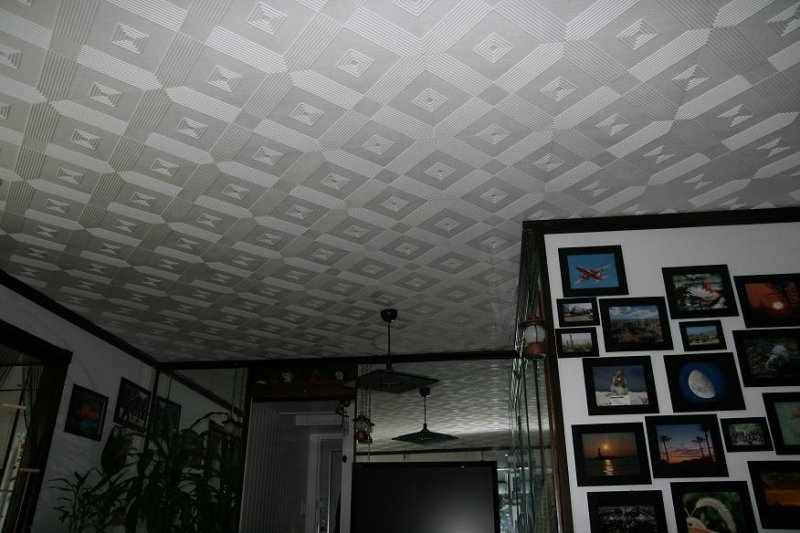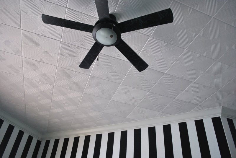 В шахматном порядке. Для оборудования «шахматной доски» на потолке понадобятся панели двух цветов. Эффектно смотрятся контрастные сочетания – черный с белым, с красным, желтым, голубым. Важно, чтобы выбранные цвета нашли поддержку в остальном интерьере пространства. Начинается оклейка от центра и продолжается до полного завершения работы. Ряды плитки располагают параллельно стенам. Дополнительный плюс этого способа в том, что с его помощью можно отвлечь внимание от неровностей основания.
