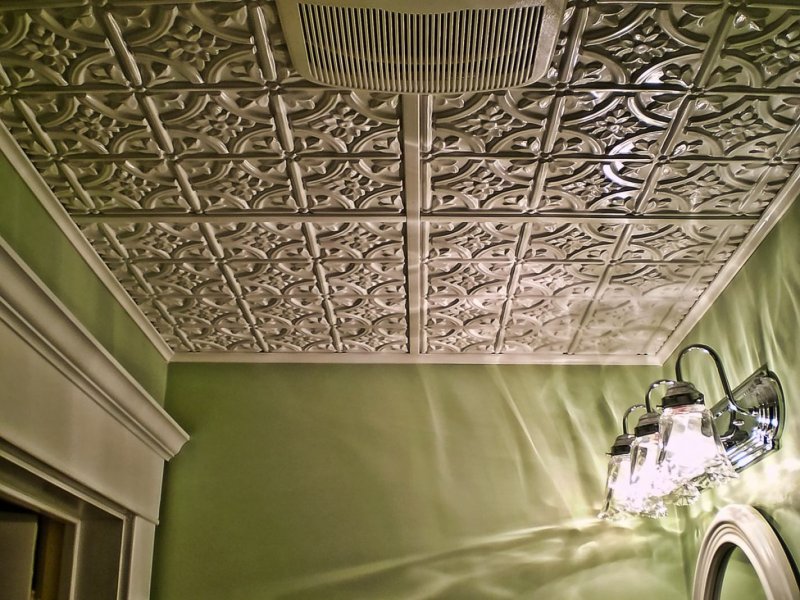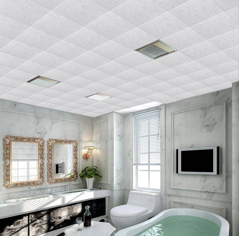 Плитка из пластика прочная и легкая, ее легко мыть и чистить. Однако она не является экологичным материалом и выгорает под солнечными лучами, поэтому лучше не использовать ее в хорошо освещаемых солнцем помещениях – гостиной или детской. А вот для ванной это отличный выбор. В условиях влажной среды эта плитка незаменима. Она не будет впитывать воду, ее легко можно помыть, не позволяя образовываться грибку. Такая плитка – хороший вариант для отделки потолка в кухне, туалете, кладовой и даже прихожей.