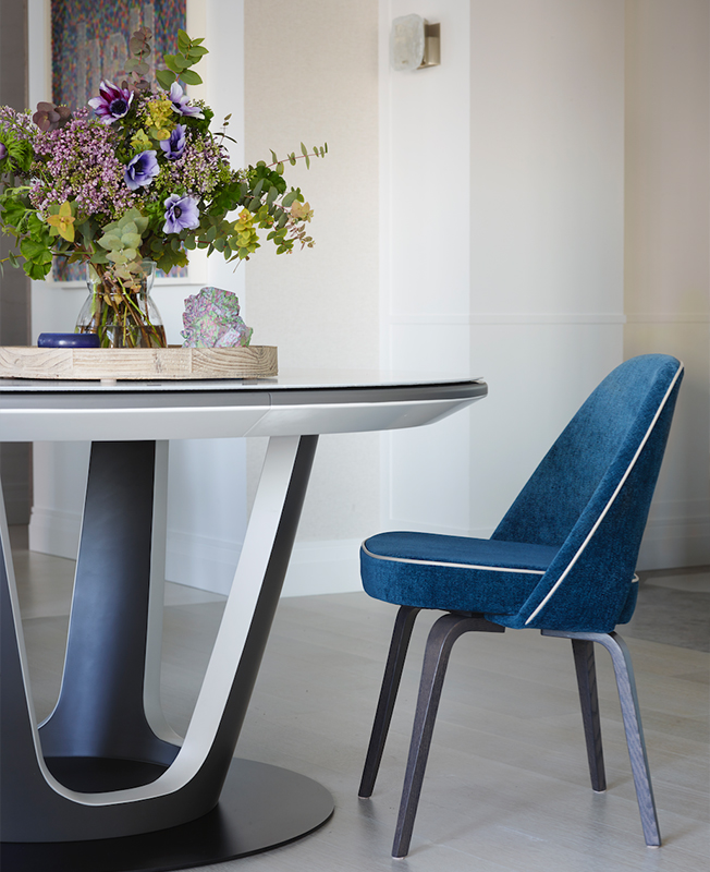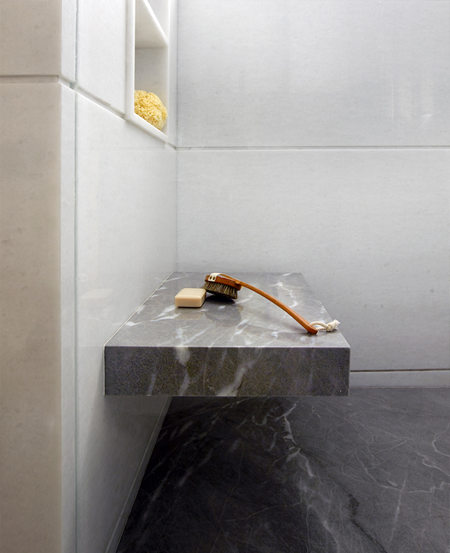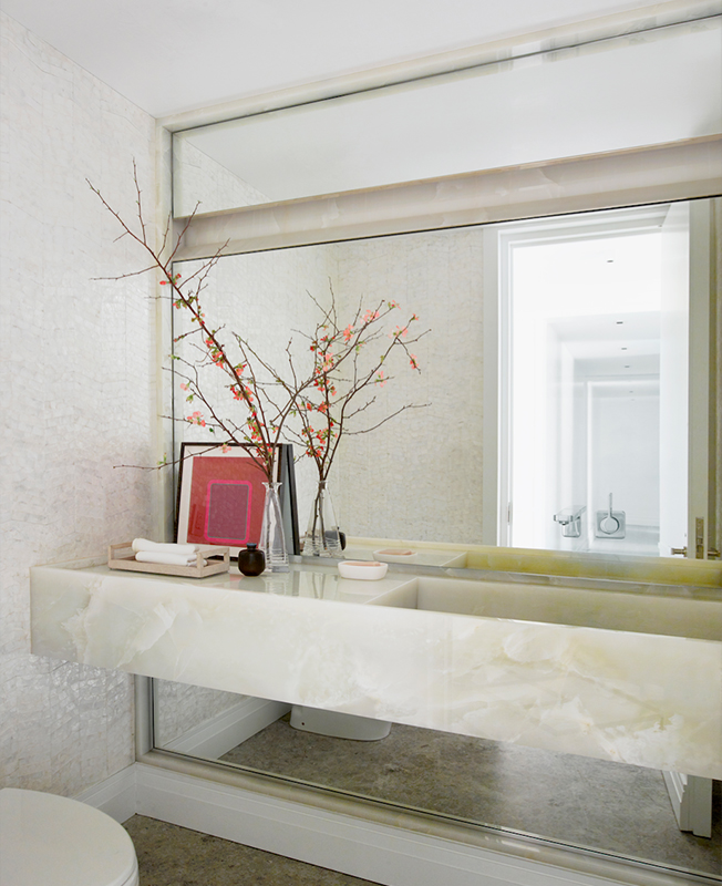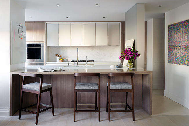 Одним из главных украшений интерьера служит выразительная фактура натуральных материалов: мрамора и древесины дуба. Функциональности добавили скрытые системы хранения, которые позволяют освободить пространство от всего лишнего.
