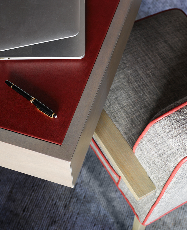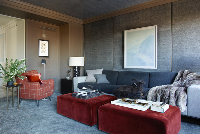 В качестве фона выбрали кремовые оттенки, отражающие свет, а также природные серые и коричневые тона. Насыщенные краски ввели дозированно, используя фактурные бархатистые обивки глубокого винного и темно-синего цветов.