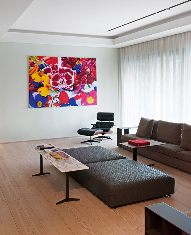 Великолепная орхидея — работа М. Куинна. Удобная группа для нетрадиционно низкого сиденья от фабрики Flexform: пуфы Bangkok и столик Fly. В углу хрестоматийное кресло с банкеткой Ч. и Р. Имз.
