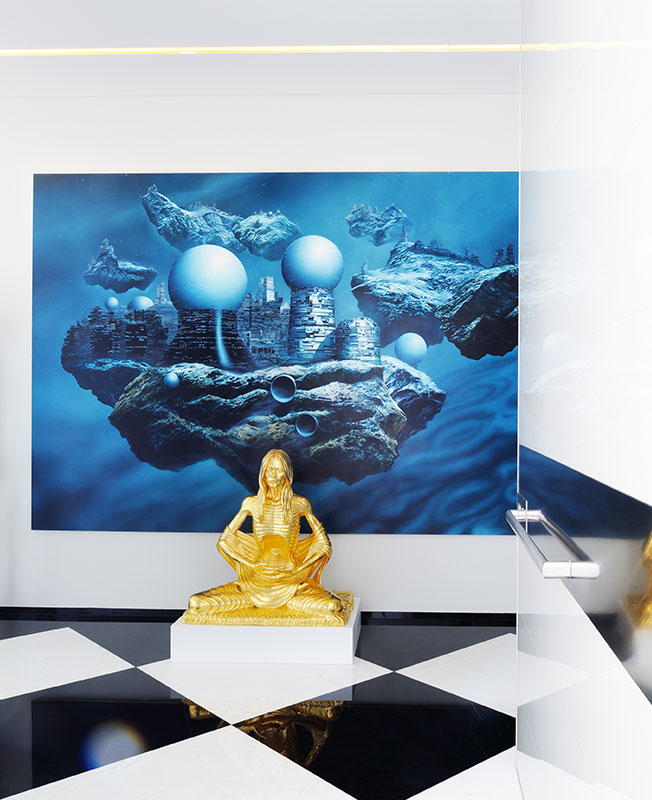 Такая композиция встречает входящего в дом: золотую скульптуру Kate авторства М. Куинна архитектор поместил на фоне работы в синих тонах Г. Брауна.