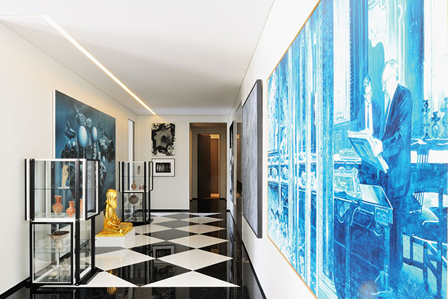 «Честно говоря, я не следую модным трендам. Просто люблю благородные натуральные материалы и вещи ручной работы (хотя и то и другое сейчас вроде как раз в тренде). Эти компоненты — самый верный путь к роскошному интерьеру. Мне нравятся простые, но хорошо обработанные — то почти не тронутые — поверхности с натуральным покрытием, не скрывающим фактуру. В таком окружении можно выигрышно подать искусство. В этом проекте я применил крупноформатную доску марки Dinesen. В холле мрамор сортов bianco sivec & nero belgio образует черно-белую шашку».