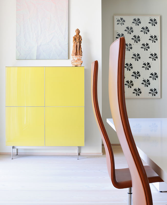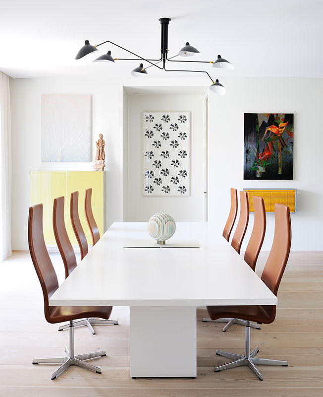 Для столовой выбраны офисные кресла с эргономичной спинкой Oxford датского классика А. Якобсена. Он спроектировал модель для Fritz Hansen в 1963 г. На стене две работы, их авторы К. Вул (справа) и Т. Ауербах. Рядом с ними шкаф Eileen Square от Rimadesio воспринимается как живописное полотно.