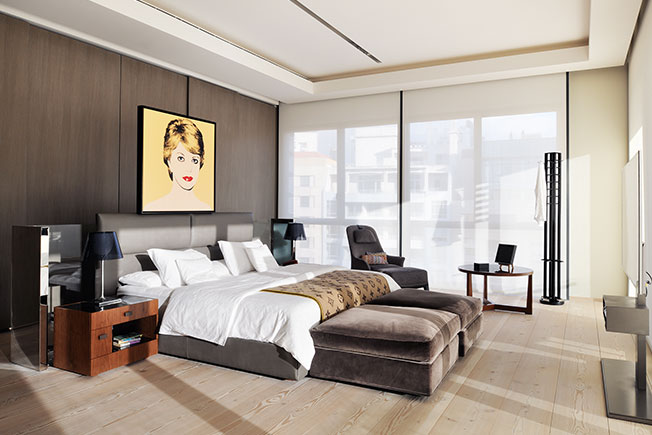 В изголовье кровати работа Э. Уорхола. Кровать и прикроватные тумбы изготовлены Claude Missir Agency’s Design специально для данного проекта.