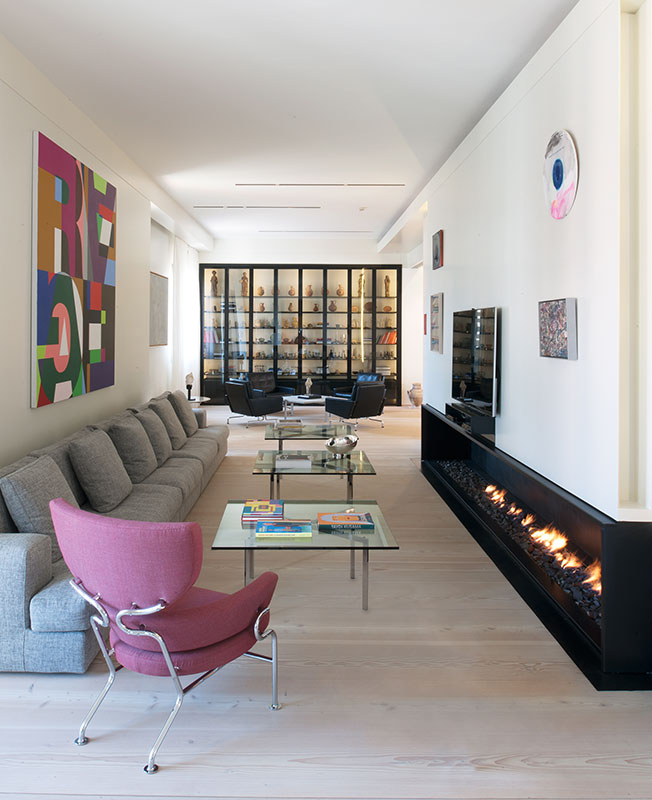 Благородная скандинавская классика — два кресла и диван Ф. Юла, а также торшер итальянца А. Кастильони — противостоят экстравагантному сиденью британца Т. Хизервика. Яркая живопись — произведение американского экспрессиониста Д. Салле.