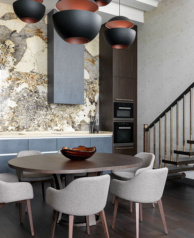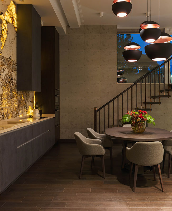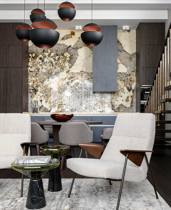 Мрамор сорта Patagonia я увидела пару лет назад на складе, когда подбирала отделки для совершенно другого проекта. Захотелось когда-нибудь облицевать им большую стену. В этом проекте панно из мрамора Patagonia мы установили в зоне кухни — решили cделать на ней акцент, придать представительcкий вид. Камень дополнили подсветкой, но для меня он прекрасен и без нее. Напоминает мне картину Брейгеля «Охотники на снегу». Черные вкрапления — как щепки, разбросанные по полю. Чтобы материалы не спорили друг с другом, я поставила кухонные пеналы глухого коричневого цвета, абсолютно матового — они выводят глянцевый мрамор на первый план. Рабочую часть кухни выполнили в цвете, перекликающимся с мрамором Arabescato Оrobico на полу в холле.