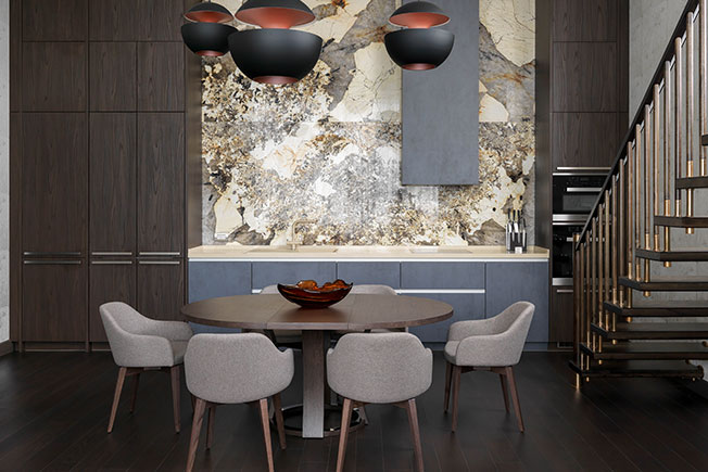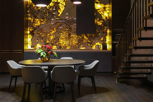 Панно из мрамора Patagonia дополнено подсветкой. Cтол Potocco. Стулья Friulsediе.