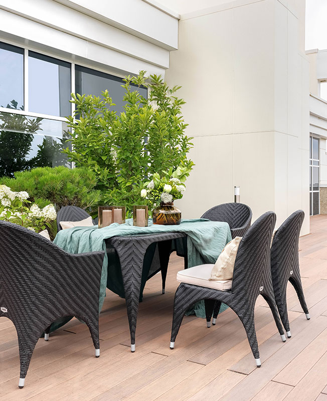 Стол — центр общения, бесед, совместных обедов и ужинов, рядом с ним лестница на террасу. Я уверена, что терраса будет одним из любимых мест семьи для проведения вечеринок. Ведь это южный город, и большую часть времени погода позволяет ужинать под открытым небом. Для озеленения террасы я использовала кустарники гортензии метельчатой, магнолию Бетти и сосну густоцветную Алиса Веркаде.