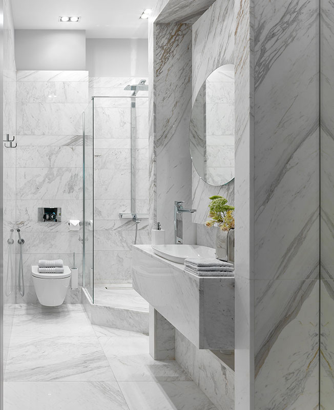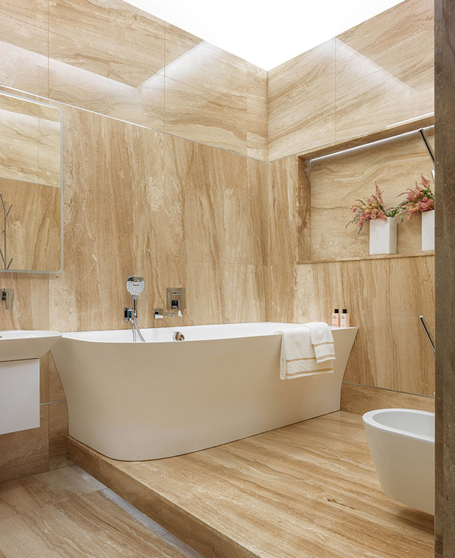 В санузлах я предложила не доводить облицовку мрамора до потолка, намеренно оставила простую покраску, без всяких карнизов. Этот прием приковывает взгляд к красоте камня. В хозяйской ванной комнате — прекрасный Daino Reale Extra. Я отбирала слэбы так, чтобы при раскрое рисунок плавно переходил с одной плиты на другую. Слэб в нише уложен горизонтально, чтобы получилась определенная точка среди вертикальных линий основной раскладки.