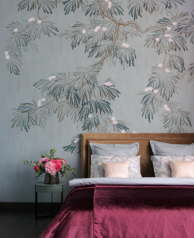 Спальня. На стенах роспись по мотивам обоев De Gournay. Столики Lema.