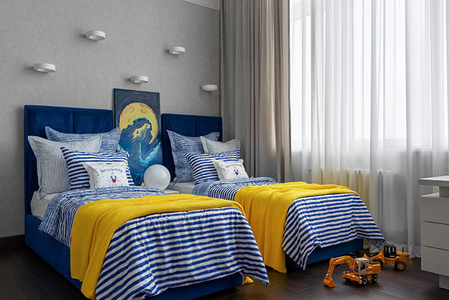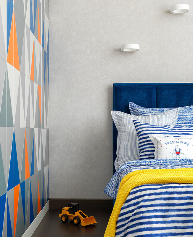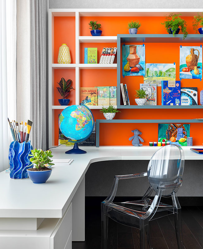 Детскую комнату создавали для двух братьев. Мне захотелось выделить зону общения за рабочим столом, но чтобы при этом у каждого было и свое рабочее место, когда начнутся уроки. Так появился стол Г-образной формы со стеллажом. Детская — солнечная комната, поэтому захотелось добавить на стеллаж апельсиново-оранжевого цвета. Между стеллажом и кроватями осталось достаточно места, чтобы собрать игрушечную железную дорогу и гоночную трассу.