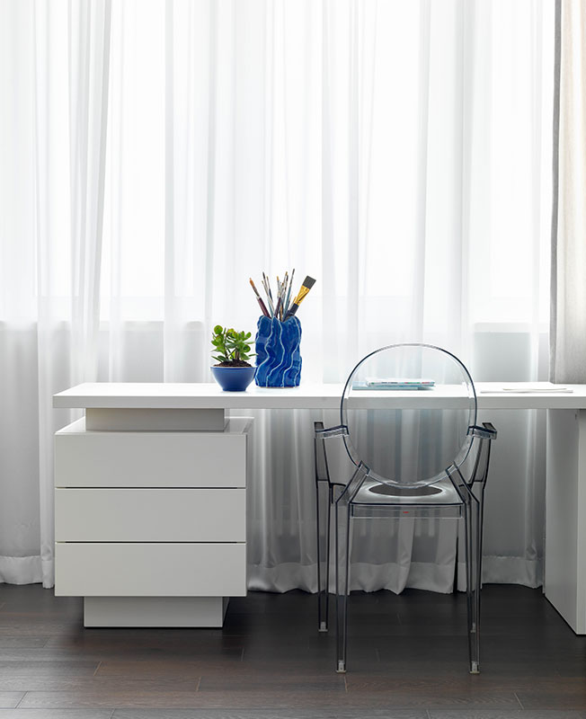 Детская. Стеллаж, шкафы и кровати изготовлены на заказ по эскизам автора проекта краснодарскими столярными мастерскими. Стул Ghost, Kartell, дизайн Филиппа Старка.