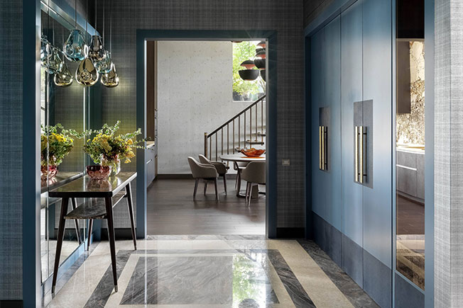 Холл. На полу мрамор Botticino Fiorito Light и Arabescato Orobico. Шкафы изготовлены по эскизам автора проекта местными столярными мастерскими. Ручки на дверях Soda Decor. Консоль Porada. Подвесные светильники Bomma.