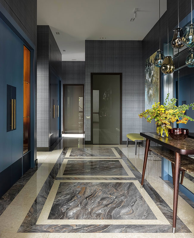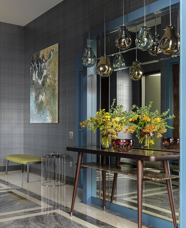 Холл. Столик Minotti. Банкетка Potocco. Консоль Porada. Подвесные светильники Bomma. Картина Константина Лупанова. На полу мрамор Botticino Fiorito Light и Arabescato Orobico. Обои Covers.
