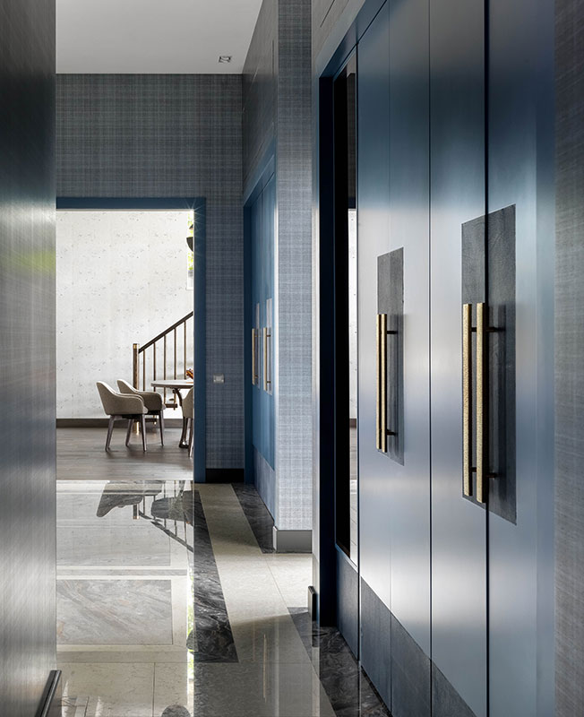 Первое, что мы видим, войдя в квартиру, — это холл. Я постаралась оформить его максимально эффектно. Ведь именно от входа в дом мы получаем первые эмоции, представления о месте, куда мы попали. Я постаралась сделать холл длинным, вытянутым относительно таких высоких потолков, чтобы входящий сразу ощущал масштаб. Симметрия в композиции больше присуща классике, но в данном случае мне показалось уместным спроектировать системы хранения симметрично. Слово «проектный» — ключевое во всей работе, практически всё в квартире выполнено на заказ по моим эскизам.