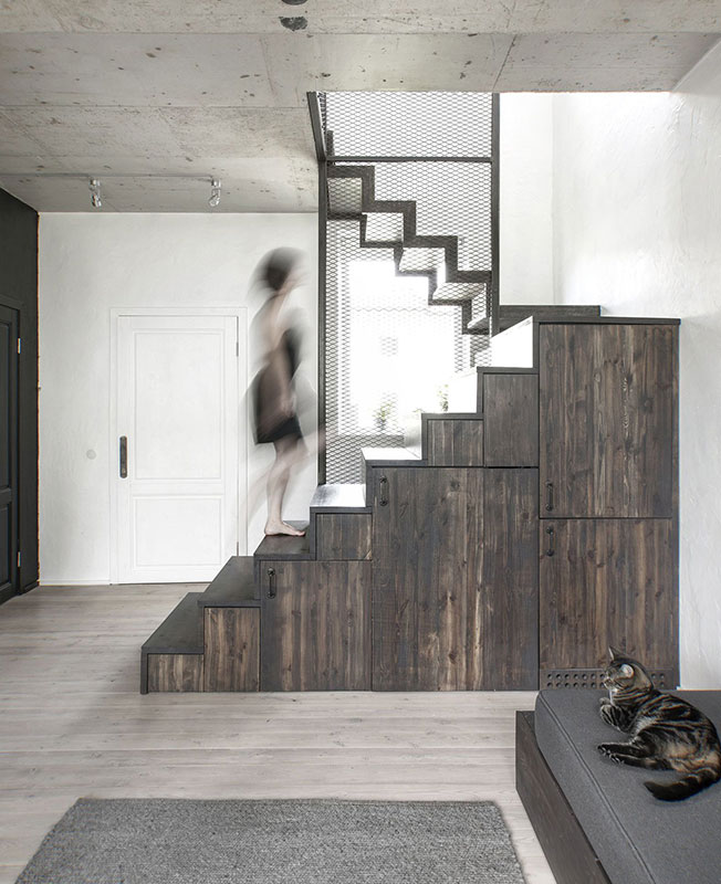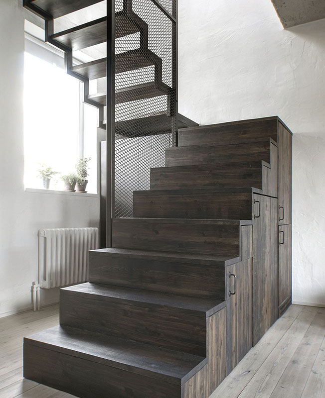 Лестница — главный элемент для хранения в гостиной. Нижний пролет представляет собой закрытую систему: под площадкой встроен холодильник и шкаф для одежды, в мелких отделениях хранятся бытовая техника, мелочи для дома и посуда.