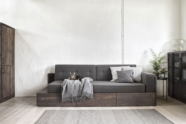 В основании дивана — три выдвижных ящика с крышками, в них хранятся постельное белье, документы и мелкая техника. В выдвинутом положении ящики используются как придиванные столики. Открытая проводка проста в монтаже и выглядит стильно.