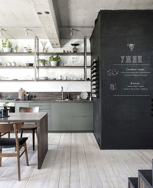 Шкафы кухни и прачечной собраны в Ikea, но так как палитра фасадов там ограничена, дверцы и ручки кухни были перекрашены в темно-зеленый цвет под заказ на стороннем производстве.