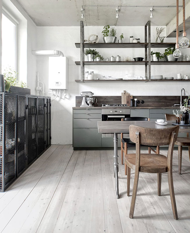 Дерево и металл — основные материалы интерьера. Архитекторы продумали хранение: разнообразная посуда расставлена на открытых полках и в металлических шкафах под окнами.