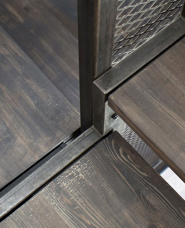 В проекте много изделий из металла. Помимо порошковой покраски в автомастерской для них использовались и другие варианты финишной отделки. Некоторые элементы покрывали специальным составом для холодного воронения стали на месте: верхний пролет лестницы, выполненный по «легкому» металлическому каркасу, а также ограждения.