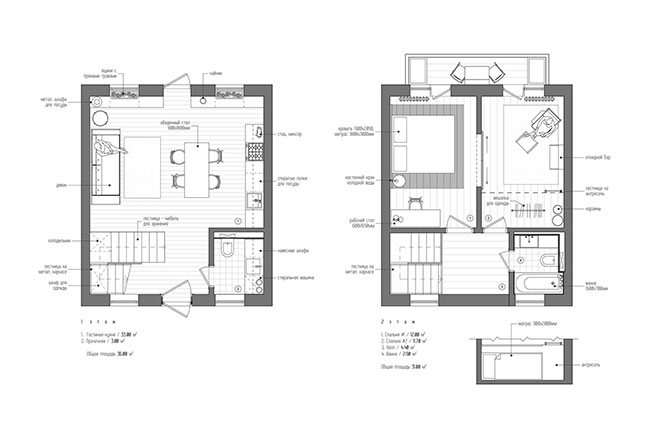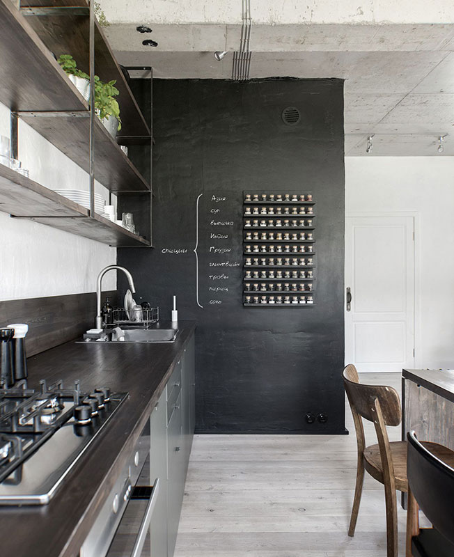 Кресло, по словам архитекторов, было спасено из рук дворников в центре Петербурга. После чего его перекрасили и перетянули брезентовой тканью. На стене разместился книжный шкаф-бар. INT2architecture — молодая, активная, мультидисциплинарная команда. Создана Александром Малининым и Анастасией Шевелевой. Даже малобюджетные проекты архитекторы умеют сделать по-европейски стильными — таунхаус под Петербургом тому пример. Вот что нам рассказали авторы. Банки для хранения специй — оригинальный декор в минималистском интерьере. «Последние несколько лет за рубежом наблюдается бум направления DIY (от английского Do it Yourself): блоги, журналы и видео-инструкции рассказывают, как делать оригинальную мебель и наполнять свой дом уютом без существенных финансовых вложений. В России это движение пока только набирает силу. Потолок первого этажа в противовес белым стенам решено было оставить бетонным — он просто зачищен и покрыт лаком. В черном кубе находится гостевой санузел/постирочная. Первый этаж занимает кухня-гостиная. Винтажные стулья имеют разное происхождение: те, что с кожаными сиденьями, прибыли из Европы, деревянные чешские куплены за небольшие деньги в московском интернет-магазине. Первый уровень занимает кухня-гостиная. Шестиметровые доски из лиственницы уложены без стыковки по длине от стены до стены. Такое покрытие выглядит благородно и визуально вытягивает помещение. Данный проект является экспериментом, цель которого — понять, что можно сделать своими руками, имея нулевые навыки в ремонте и производстве мебели, с помощью обычных бытовых инструментов. На втором этаже одежда хранится в выдвижных ящиках кровати, а также на открытой вешалке под антресолью. Кресло: винтаж. На стене разместился книжный шкаф-бар. На полу килим 1970-х. Спальню разделяют раздвижные перегородки. В будущем здесь можно будет создать две комнаты. Благодаря большой высоте потолков, удалось сделать антресоль с гостевым спальным местом. Конструкция выкрашена в белый цвет, как стены и потолок. На втором уровне расположилась просторная спальня. В будущем можно будет отделить гостевую спальную зону или детскую. Двухуровневый таунхаус площадью 67 кв. метров расположен в пригороде Петербурга. Помещения изначально стояли без разводки инженерных коммуникаций и без какой-либо отделки. Инженерные работы были осуществлены профессионалами. Металлические шкафы, ограждения, полки и лестницы за символическую плату сварены и покрашены в цеху дружественной автомастерской неподалеку. Все остальное сделано самостоятельно: штукатурка и покраска стен, зачистка и лакировка бетонного потолка, укладка и покраска пола, сборка антресоли, а также изготовление мебели, светильников и декора. Лестница — главный элемент для хранения в гостиной. Нижний пролет представляет собой закрытую систему: под площадкой встроен холодильник и шкаф для одежды, в мелких отделениях хранятся бытовая техника, мелочи для дома и посуда. Лестница — главный элемент для хранения в гостиной. Нижний пролет представляет собой закрытую систему: под площадкой встроен холодильник и шкаф для одежды, в мелких отделениях хранятся бытовая техника, мелочи для дома и посуда. Основа под диван спроектирована с тремя выдвижными ящиками с крышками, в них хранятся постельное белье, документы и мелкая техника. В выд