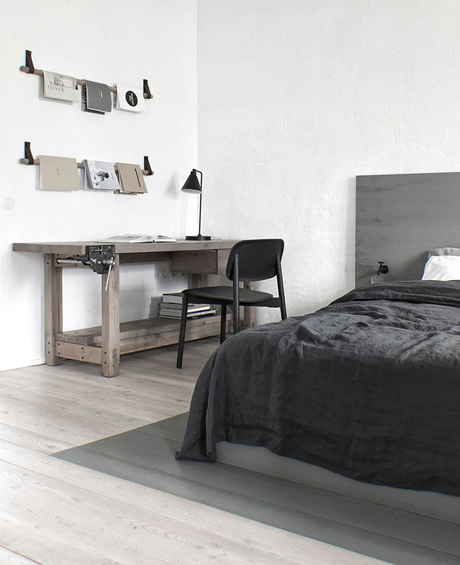 Фактура стен напоминает стены в «мазанках» — традиционных глинобитных домах. Такого визуального эффекта удалось добиться наложением нетолстого слоя штукатурки с помощью кельмы и последующей окраской. Рабочая лампа House Doctor.