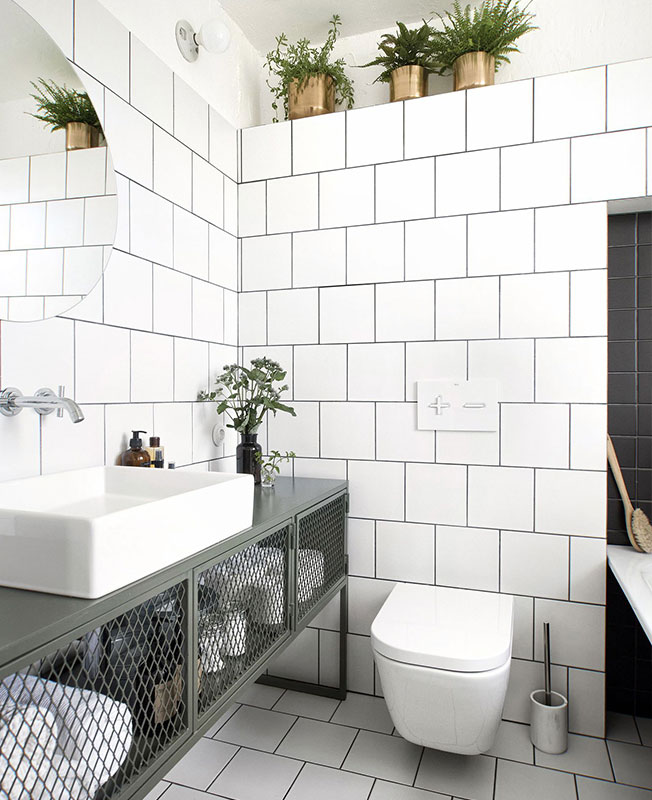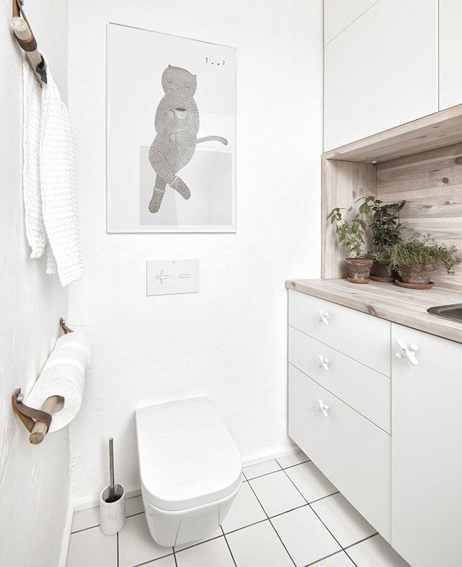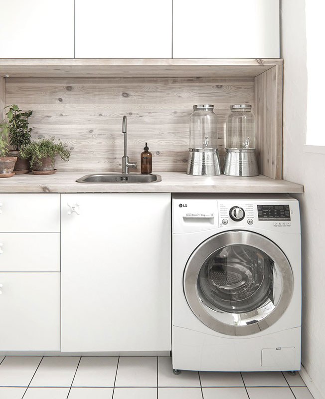 В прачечной, совмещенной с гостевым санузлом, создана стена из небольших шкафов для складирования бытовой химии, полотенец, инвентаря для уборки и т. п. Стирально-сушильная машина LG.