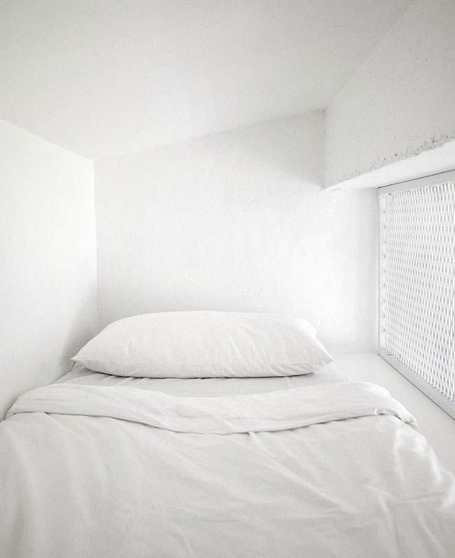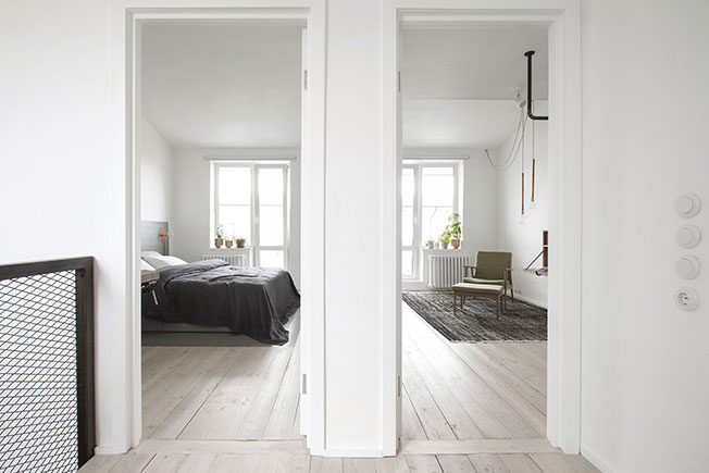 Спальню разделяют раздвижные перегородки. В будущем здесь можно будет создать две комнаты. Благодаря большой высоте потолков, удалось сделать антресоль с гостевым спальным местом. Конструкция выкрашена в белый цвет, как стены и потолок.