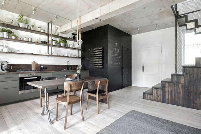 Первый этаж занимает кухня-гостиная. Винтажные стулья имеют разное происхождение: те, что с кожаными сиденьями, прибыли из Европы, деревянные чешские куплены за небольшие деньги в московском интернет-магазине.