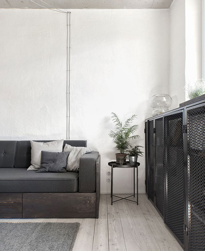 Двухуровневый таунхаус площадью 67 кв. метров расположен в пригороде Петербурга. Помещения изначально стояли без разводки инженерных коммуникаций и без какой-либо отделки. Инженерные работы были осуществлены профессионалами. Металлические шкафы, ограждения, полки и лестницы за символическую плату сварены и покрашены в цеху дружественной автомастерской неподалеку. Все остальное сделано самостоятельно: штукатурка и покраска стен, зачистка и лакировка бетонного потолка, укладка и покраска пола, сборка антресоли, а также изготовление мебели, светильников и декора.