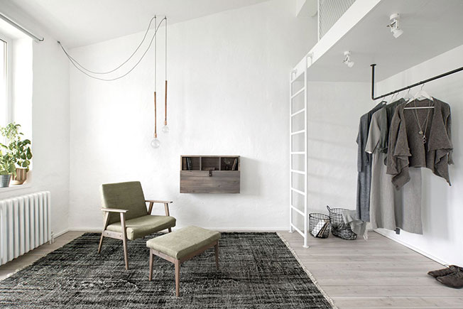 На втором этаже одежда хранится в выдвижных ящиках кровати, а также на открытой вешалке под антресолью. Кресло: винтаж. На стене разместился книжный шкаф-бар. На полу килим 1970-х.