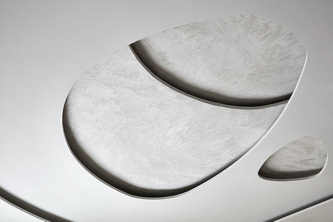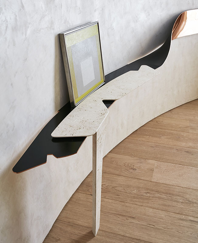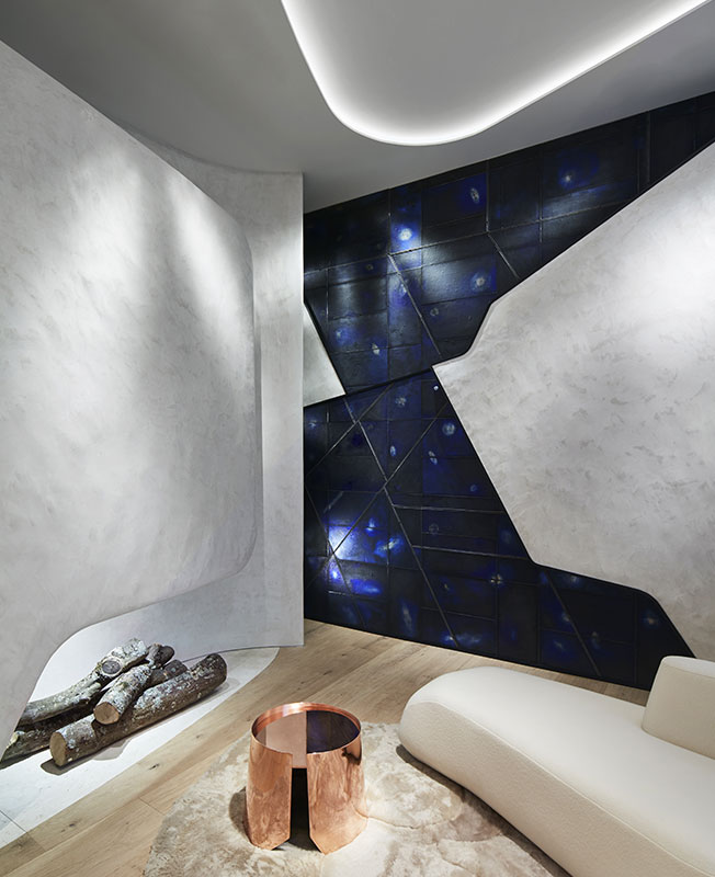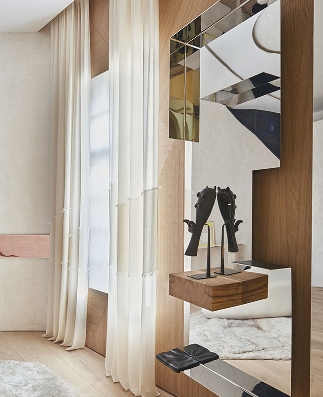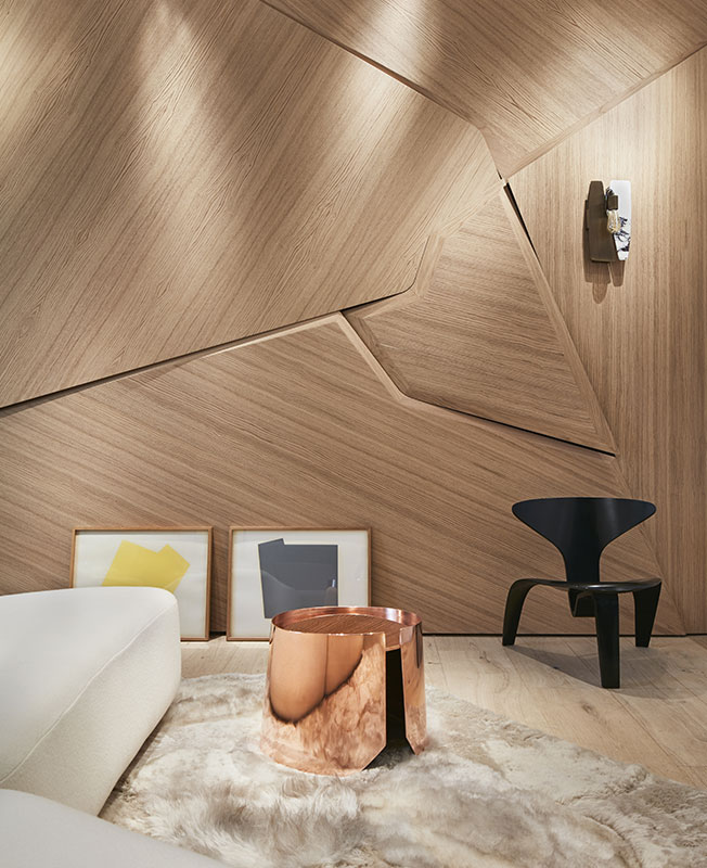 Пространство задумано как захватывающий опыт. Сложные стены и потолок, соединяющие гипс, дерево и черный глянец, акцентированы сложной графикой плоскостей. Консольный стеллаж встроен в динамичную архитектуру комнаты. Он, как настоящий предмет коллекционного дизайна, сделан из нескольких материалов: латуни, камня и композита. В центре гостиной — островной роскошный диван. Идеальная мебель для долгих бесед с глазу на глаз.