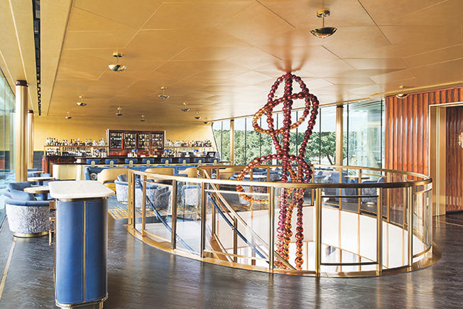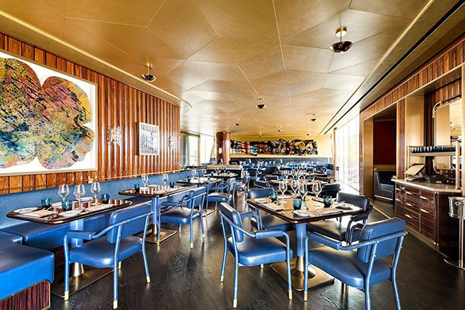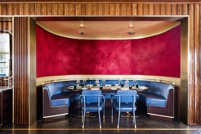 Адепт самого избыточного максимализма, лондонский дизайнер Мартин Брудницки гордится проектом ресторана французской кухни Bullion в американском Далласе. Карьера Брудницки, главы солидной студии Martin Brudnizki Design Studio, началась в Лондоне, но американцы не могут упустить такого профи. Семья Хартланд-Маки пригласила декоратора в Даллас, где компания Gensler отремонтировал офисную башню Хартланд-Маки, 400 Record. Ресторан Bullion парит над 7-ми метровым потолком лобби здания. Фотограф Dror Baldinger / Gensler. Мартину Брудницки показали верхний этаж здания, где должен был расположиться ресторан высокой французской кухни Bullion. Кухню определяет обладатель мишленовской звезды шеф Брюно Девайон. Стулья с медными элементами изготовлены на заказ. Они отлично сочетаются с латунью барной стойки. Мартину Брудницки понравилось помещение и он сочинил интерьер, сделав ставку на гламур. 530 кв. метров трактованы в стилистике французской брассери. «В типичной брассери есть органичения на использование элементов, — объясняет дизайнер. — Один стул, одна кожа или ткань. Детали могут быть причудливыми, но не слишком. Например, розово-золотой потолок простирается от бара через основной зал». 530 кв. метров трактованы в стилистике французской брассери. Голубой с золотом ожидаемо звучит по-королевски. Но Мартин решил усилить палитру большой красной фреской, которую написал художник Мэтью Чэмберс. А владельцы не поскупились на авторскую скульптуру модного парижского художника Жана-Мишеля Отоньеля. Так что при всех органичениях, Мартин Брудницкий снова сделал шикарный декоративный проект. Лестницу украшает скульптура известного парижского мастера Жан-Мишеля Отоньеля Necklace of Dreams. 530 кв. метров трактованы в стилистике французской брассери. Работа Мэтью Чэмберса висит на панелях из привезенной из Нигерии афромосии.