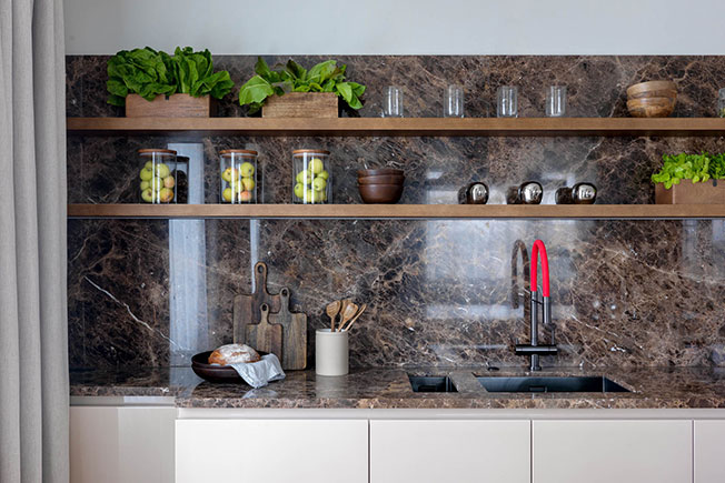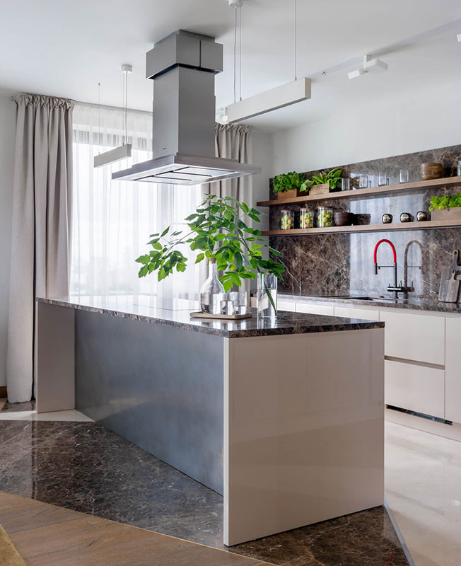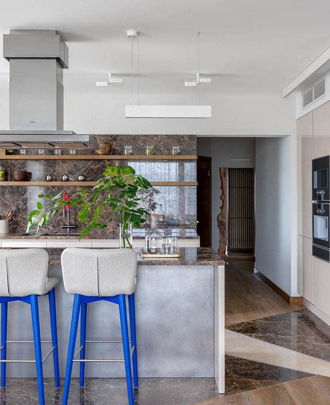 В отличие от большинства проектов Art Group, изобилующих яркими красками, этот интерьер получился непривычно спокойным. Нейтральную палитру компенсирует разнообразие фактур: древесина, мрамор, декоративная штукатурка. Наполнение, как и цветовая гамма, также приглашает к отдыху и восстановлению.