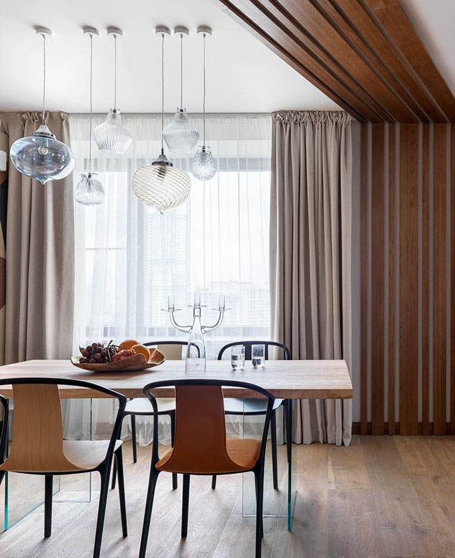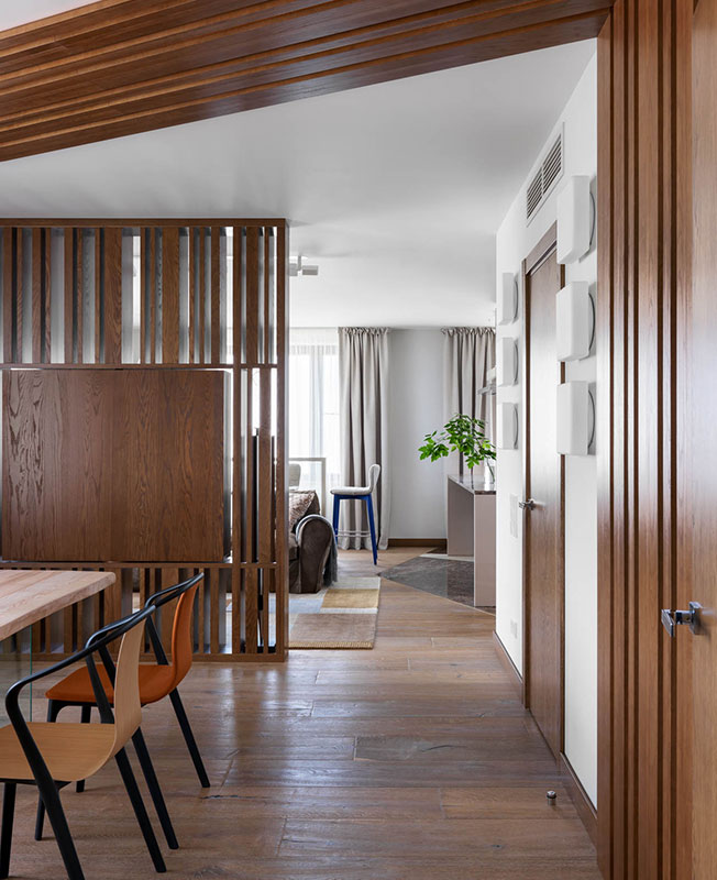 «В каждом проекте для нас важно создать правильную архитектуру пространства, чтобы оно было самодостаточным и без декора, хотя и его мы любим». В роли «архитектурного каркаса» выступают столярные конструкции со встроенным светом. Изготовленные в столярной мастерской по эскизам Art Group, они и зонируют пространство, и объединяют его: элементы из деревянных реек украшают почти все комнаты в квартире.